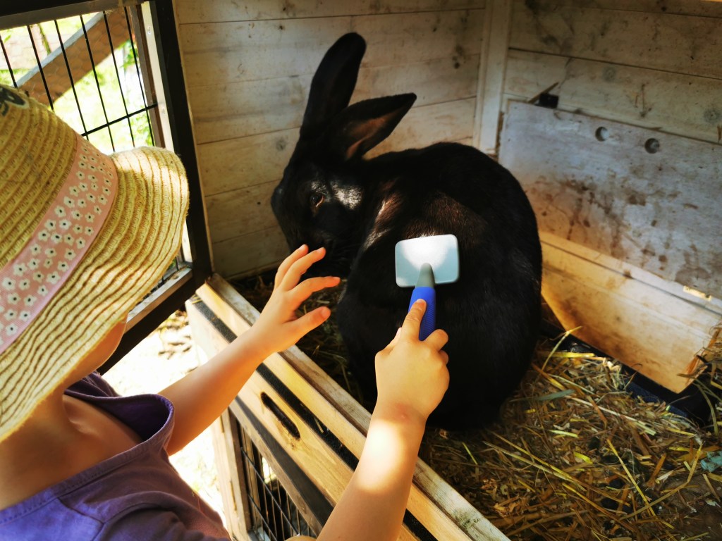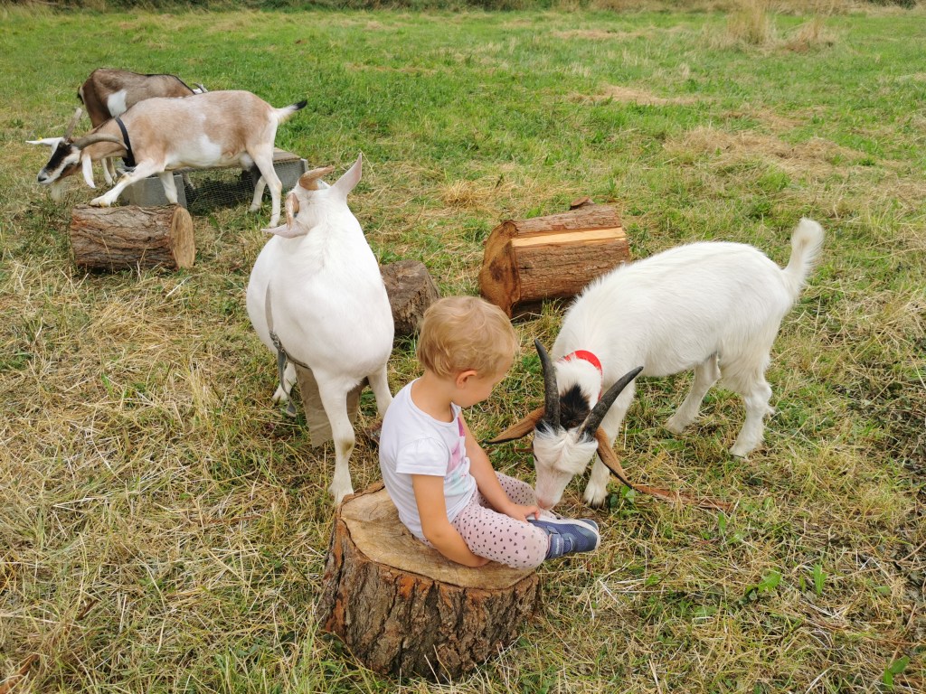 - Wir besuchen die Ziegen, Kühe, Kaninchen und Meerschweinchen und füttern und streicheln sie von außen. Zu den Kaninchen und Meerschweinchen können die Kinder auch ins Gehege gehen.