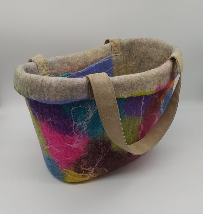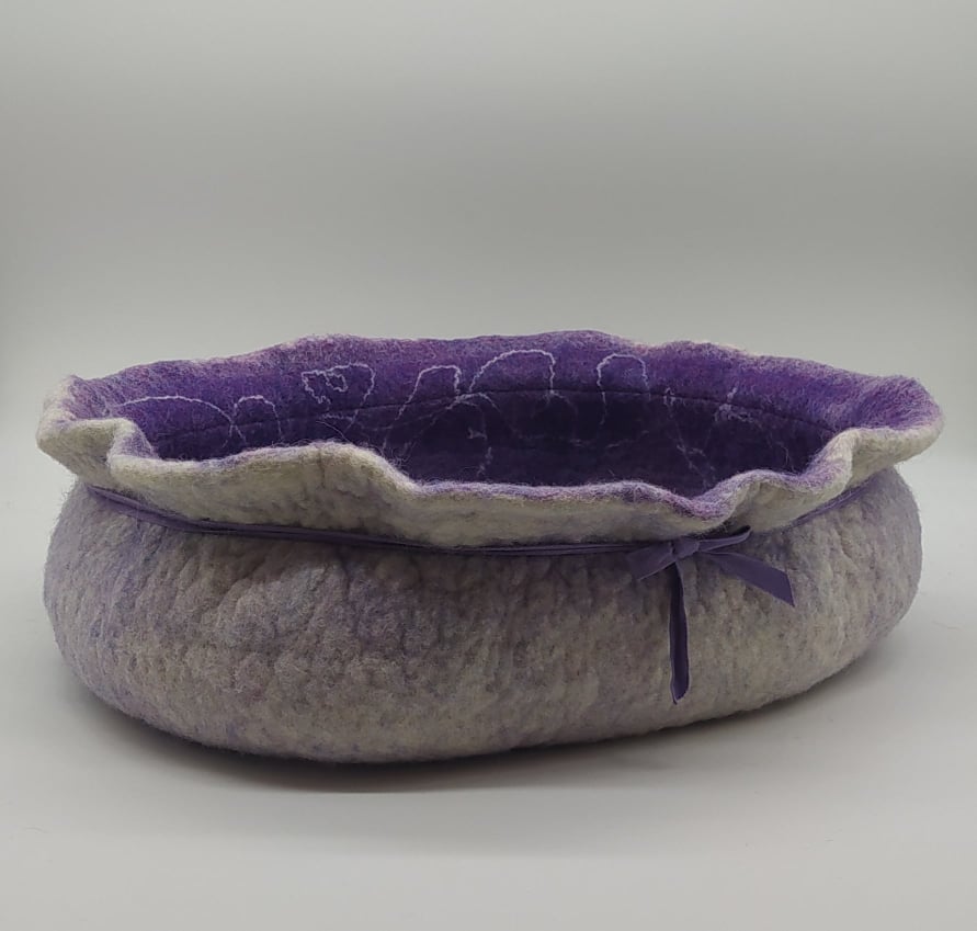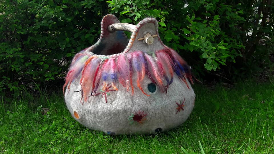 Ihr lernt verschiedene Möglichkeiten, Effekte und Muster in eure/n stabile/n Katzenhöhle/Korb zu filzen.