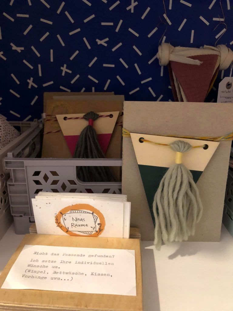 Mein Name ist Janina Müller-Höreth („Ninas Räume“), bin eigentlich Kostümbildnerin und habe mich aber nach meiner Karenz im Bereich Raumgestaltung selbstständig gemacht. Neben privaten Aufträgen stelle ich textile Wohnaccessoires her, wie Wimpeln und dergleichen. Aber auch aus Holz laser ich -unter anderem- Wimpel aus und bemale diese noch von Hand.